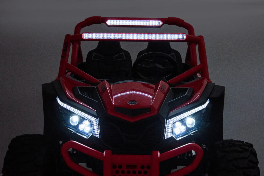 Kids can enjoy Bluetooth music, USB, AUX and realistic sounds, while bright LED headlights enhance the driving experience. Control is selectable manual mode OR remote mode, ensuring safe supervised play when needed. With its bold red finish and rugged stance, this ZForce RZR Turbo stands out as the King of UTVs.