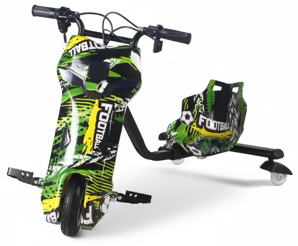 Turn every ride into a game with the 36V Electric Drift Trike Green Football Edition. Designed for kids who love both action and style, this unique ride-on drifting kart features a sporty football-themed design with bold green and black graphics. Powered by a 250W brushless motor and a dependable 36V lithium battery, it offers up to 90 minutes of continuous fun. The solid 8-inch front tire and caster-style rear wheels are made for slides, drifts, and spins, giving kids the ultimate backyard or driveway experience. With three speed settings, LED light strips, and a key-start throttle, this drift trike blends modern features with non-stop excitement.