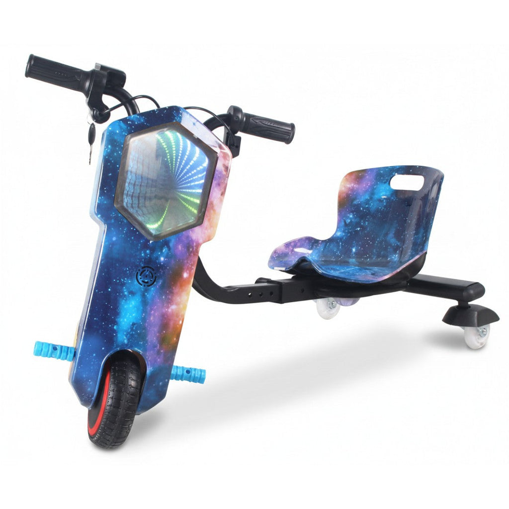 Turn playtime into an adventure with the 36V Kids Drift Trike Galaxy Edition. Designed with a stunning cosmic-inspired finish and vibrant LED effects, this drifting kart is built to impress. Powered by a 180W brushless motor and a reliable 36V lithium battery, it reaches speeds of up to 12 km/h for thrilling drifting action. The 6.5-inch solid front wheel and smooth caster-style rear wheels allow kids to spin, slide, and drift with ease, while three adjustable speed modes give flexibility for both beginners and confident riders. Bluetooth connectivity, front and rear laser lights, and a key-start throttle make this trike modern, fun, and exciting to ride.